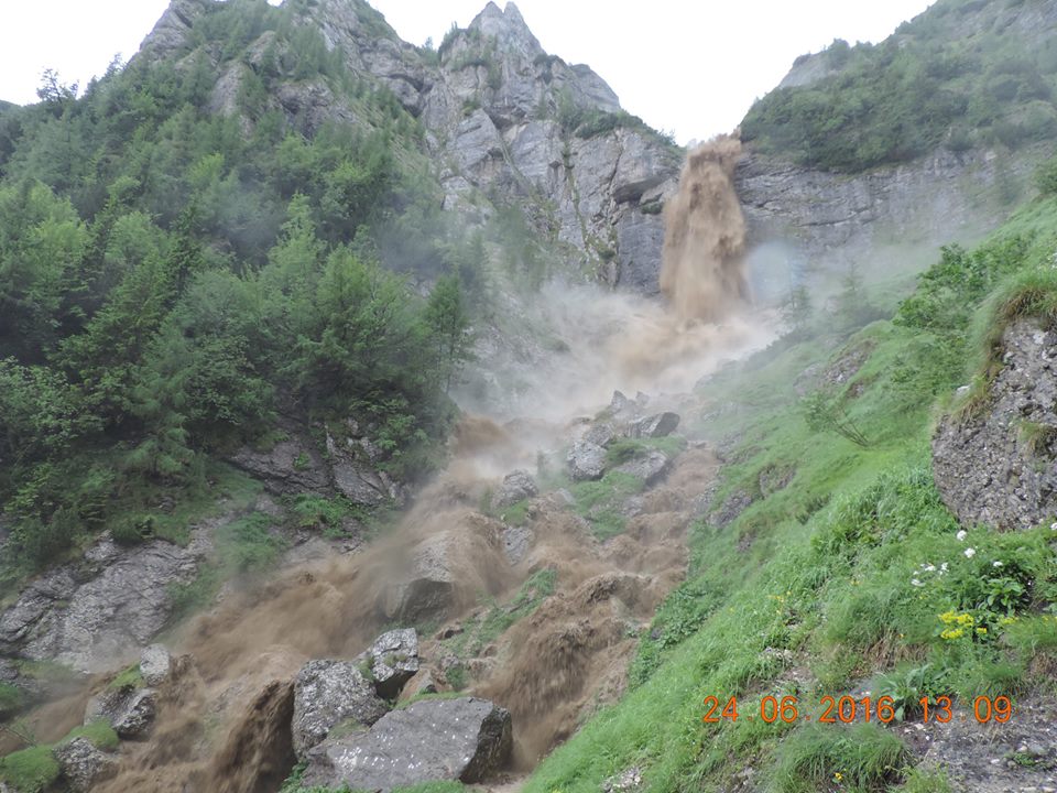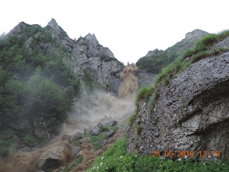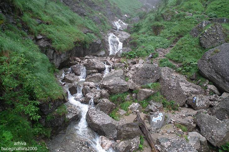 Intrare in traseu la 8:22. Nu inainte de a analiza un pic albia Vaii Jepilor. De cand seful Salvamont Busteni, d-l Gigel Haiduc, a postat un torent peste cascada Caraiman, ne uitam cam toti la apa asta dupa fiecare ploaie. Si cum tot a plouat… :)