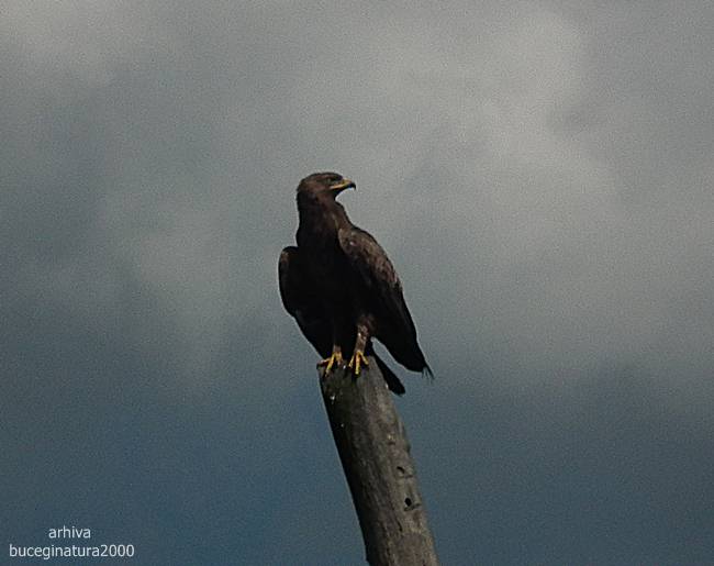 O acvila observata din masina, pe un stalp pe marginea soselei…