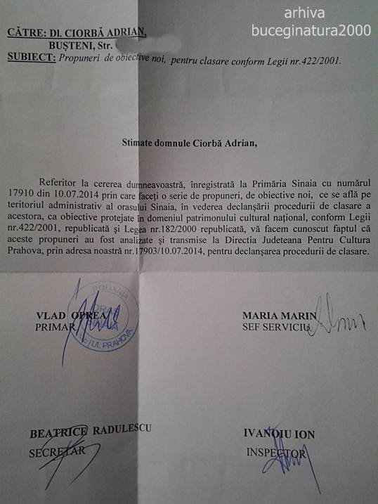 Intr-o adresa a Primariei catre Directia de Cultura, Culte si Patrimoniu Prahova, apare acest obiectiv. I-am pus in legatura si pe unii si pe altii, am adresele lor si… dupa niste ani, nu au facut nimic! Mai mult de atat au si scris eronat la un obiectiv declarat de ei monument istoric, microhidrocentrala de pe paraul Peles, ca este fosta moara a Manastirii Sinaia… Care era cu totul altceva si in cu totul alta parte.
