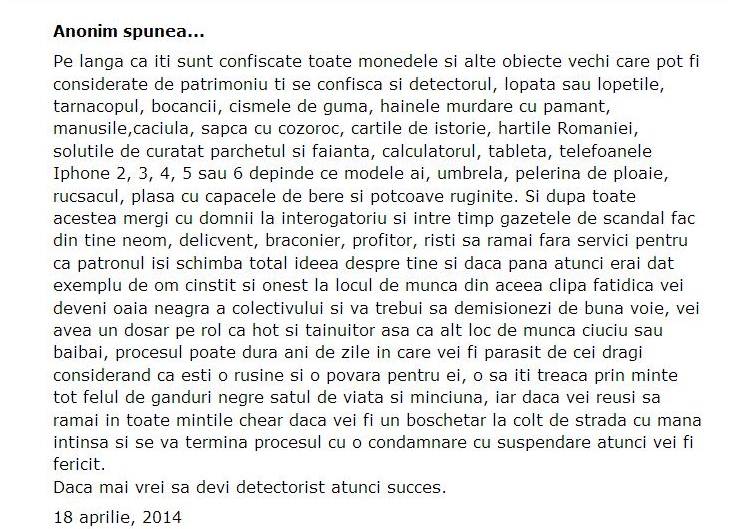 Aceste articole sunt binevenite, pentru ca se anuleaza acea etichetare a specialistilor, care propaga ideea ca toti care au un detector braconeaza situri. Simplul fapt ca te pozeaza unul umbland cu detectorul in preajma unei cetati, inseamna dosar penal si confiscarea detectorului. In afara de hoti care stiu cum sa vanda ce gasesc pe piata neagra si care folosesc detectoare pentru care nu au autorizatie, ca nu le trebuie evident, nu incalca nimeni in mod constient legea. Cea mai mare parte a detectoristilor sunt autorizati. Ei sunt oameni educati care vor sa participe la gasirea elementelor ce tin de istoria nationala. Este simplu! Dar, cum in cativa ani, detectoristii au predat statului cat au scos din pamant specialistii in 50 de ani, normal ca faci totul ca sa arati ca astia sunt niste hoti de fapt! :)