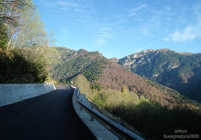 Spre Bucegi pe DJ 713, pe 18.04. Se observa cum inainta primavara in altitudine pe padurea din dreapta. Clar, cu o saptamana cel putin, venise primavara mai devreme in 2016.