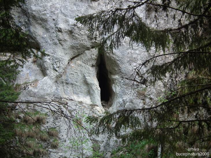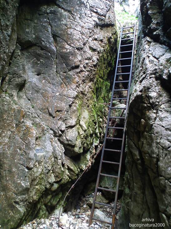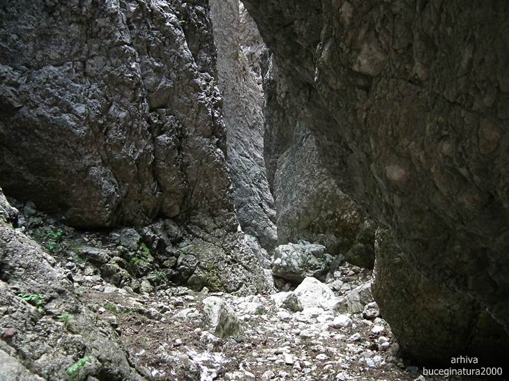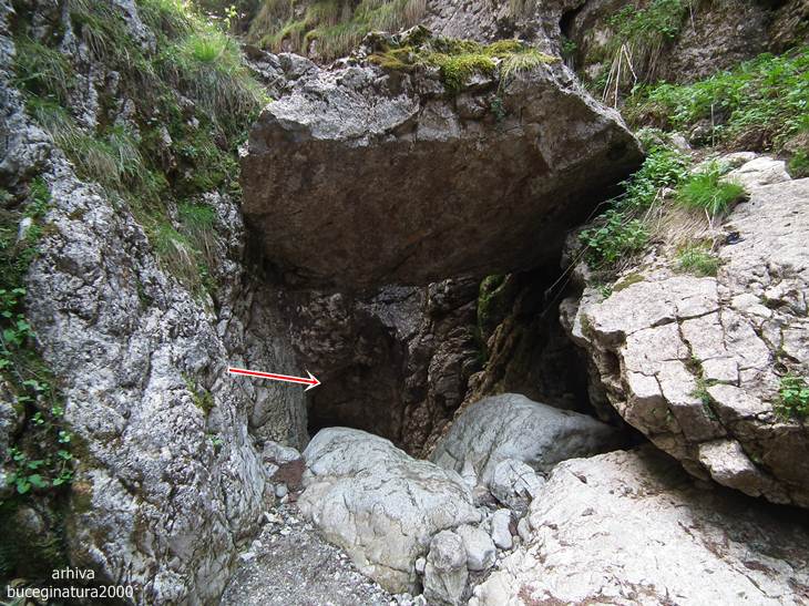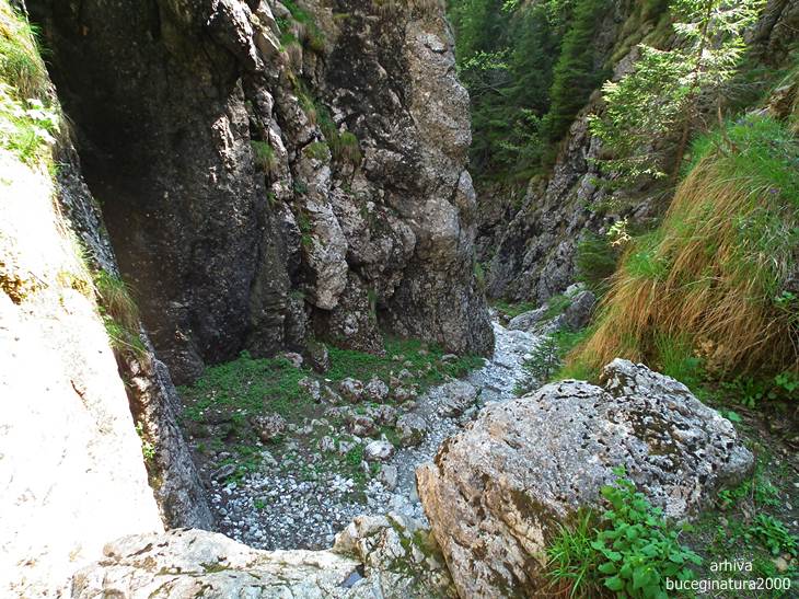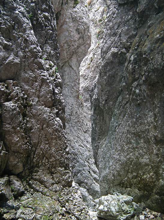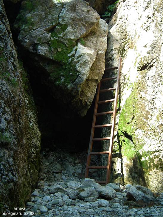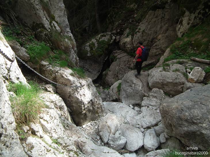 Traseul te poarta pe sub aceasta portita. O sa vedeti un marcaj cruce verde, el nu este insa turistic. E desenat demult prin aceasta vale. Traseu turistic nu exista pentru ca suntem in tara in care putini isi asuma responsabilitati. Plus ca ar trebui si alte amenajari, desi, la aprecierea mea, un montaniard nu intampina probleme pe aici. Sunt lanturi, cordeline, scari…