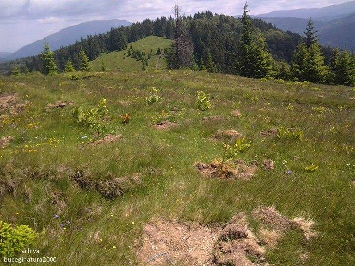 De la distanta zici ca au ramat nu stiu ce animale. De fapt, a bagat omul cazmaua de vreo 4 ori, a dat pamantul la o parte si gata. A plantat un lastar si a lasat pamantul asa. Tot ce vedeti in imagine, ma refer la poiana, este plantat cu puieti de molid, lastari de fag, paltin. Prin poienile acestea mai ies caprioare, cerbi, ursi, tot felul de animale, fiind singurele pajisti ale zonei. Si cineva le-a impadurit.