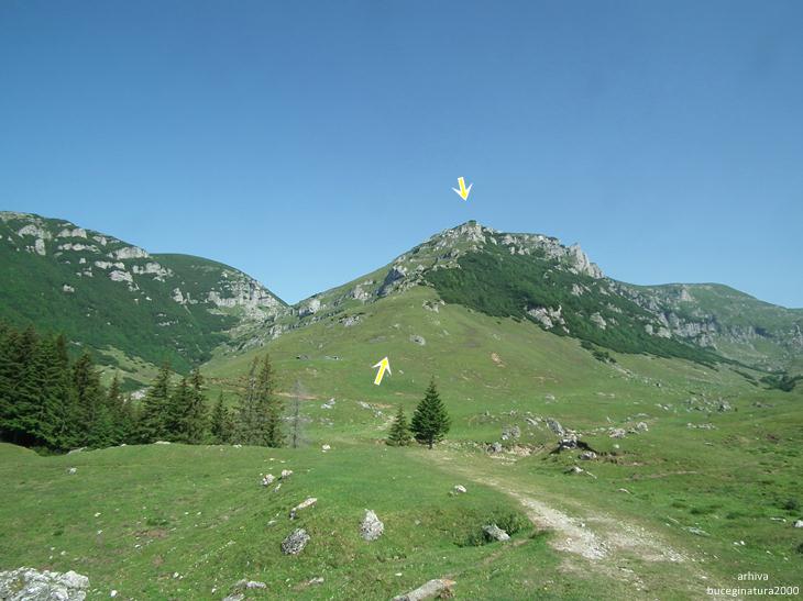 Se vede jos un stalp. De la acesta, abia mai sus se vede poteca marcata. De la stalp mai pleaca o poteca insa nemarcata, spre dreapta cum se priveste poza… trebuie putina atentie.
