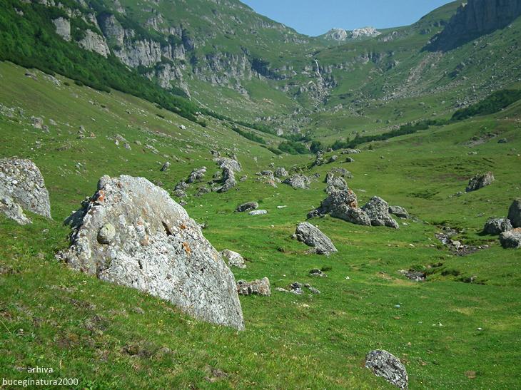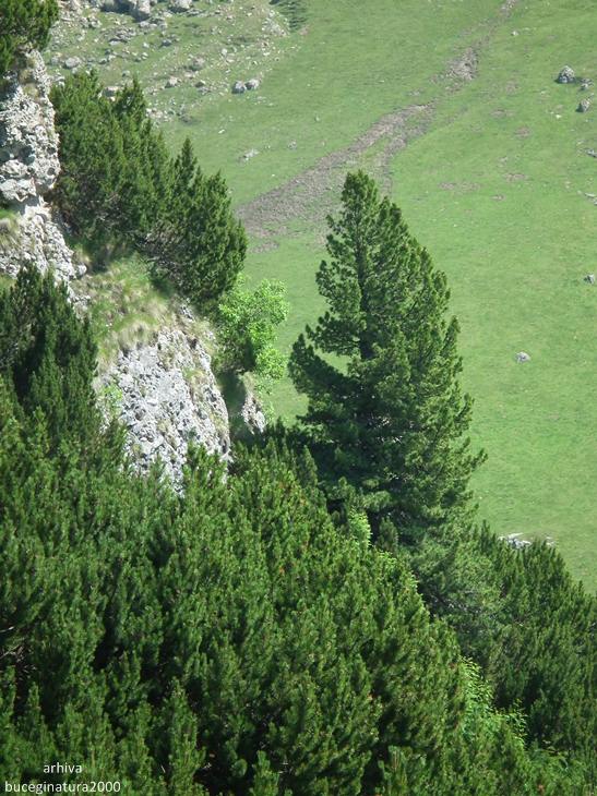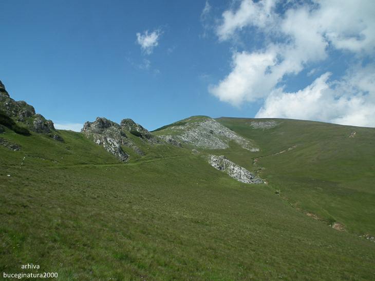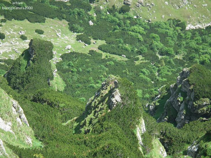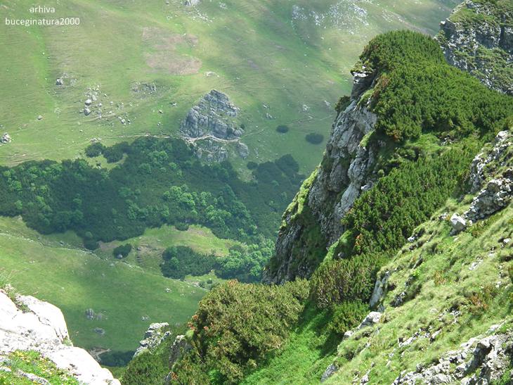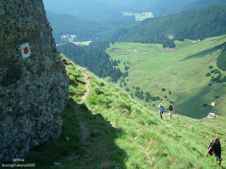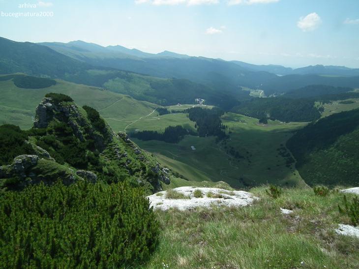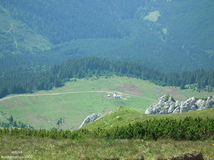 Poiana Gutanului vazuta din preajma Drumului Granicerilor. Acest drum, azi traseu turistic marcat cu banda rosie, nu este chiar un drum propriu-zis, ci o poteca lata pe care patrulau in trecut granicerii romani si austro-ungari. Azi traseul turistic leaga Vf. Omu de zona Padina.