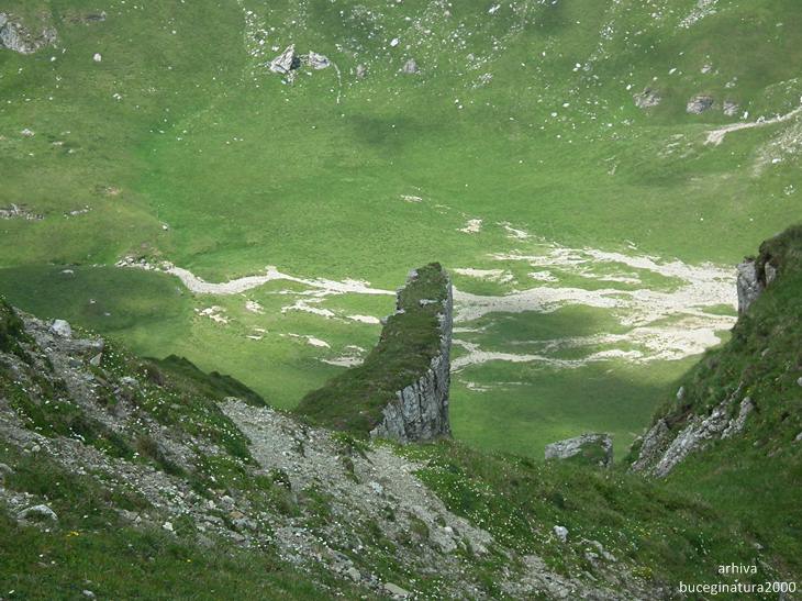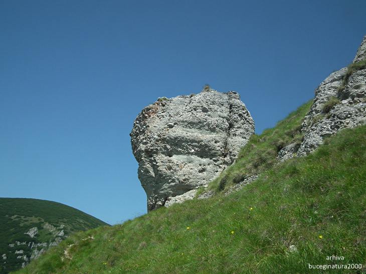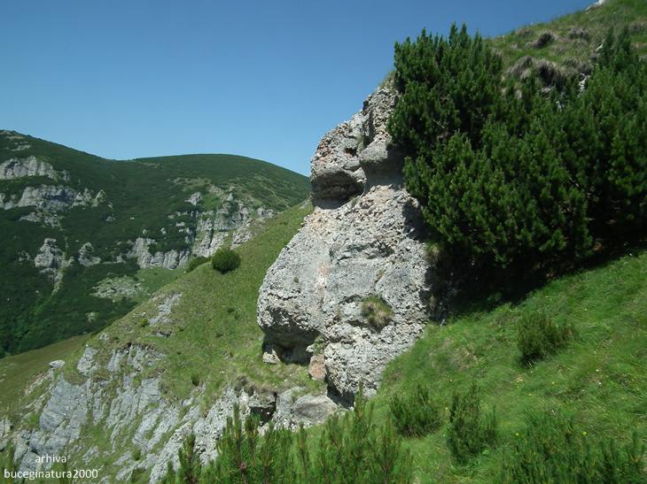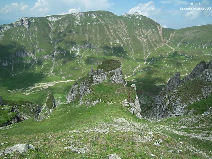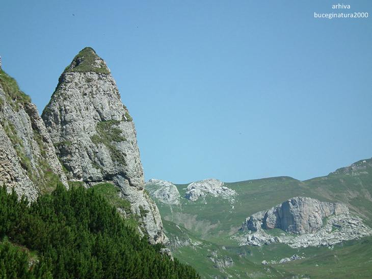 Traseul turistic ce urca de la Pestera la Vf. Omu. In vederile vechi, langa stanca de jos era un bolovan imens care pana la urma s-a erodat si a cazut prin jnepeni.