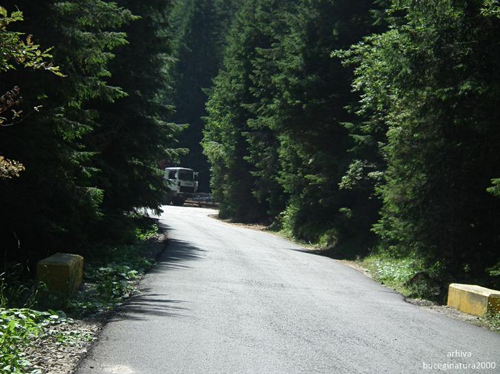 Si la o curba a drumului ce sa fie? O exploatare forestiera. Fara panou de exploatare… treaba e ca nu aveau cine stie ce lemn ca sa apucam calea conspiratiei si a ecologiei fara sens. Oricum, pe acolo padurea e foarte deasa si taierea avea semnele unei taieri rationale. Sigur daca veneau ecologistii de ocazie, cu ursuletii de plus, mai iscau un scandal. Sau cine stie ce pseudo-jurnalist. Fara niciun dubiu ar fi vazut in blocarea drumului o actiune a mafiei lemnului care a planificat devastarea padurilor muntelui Dichiu :)