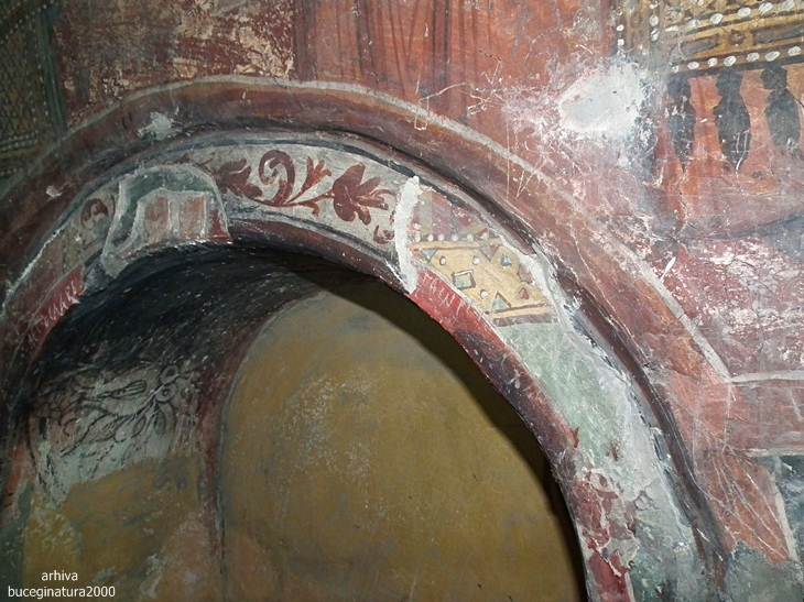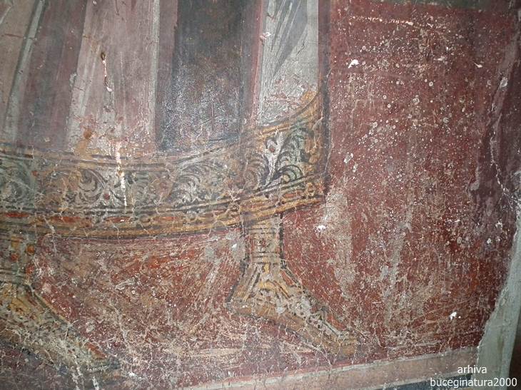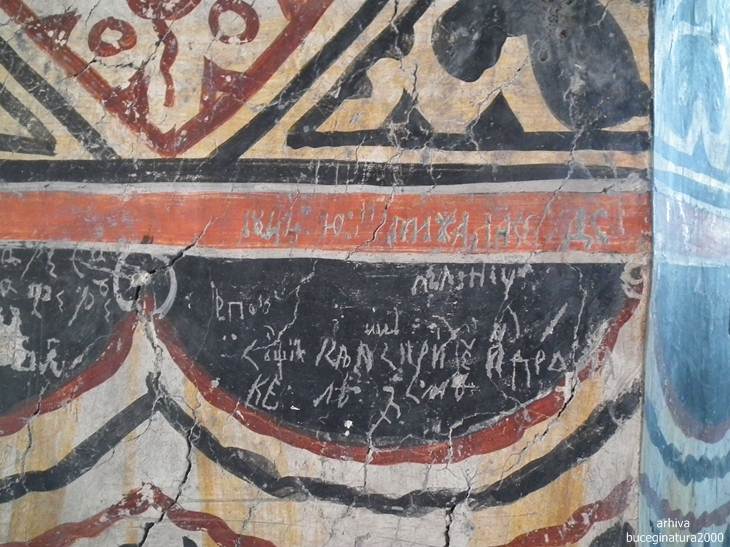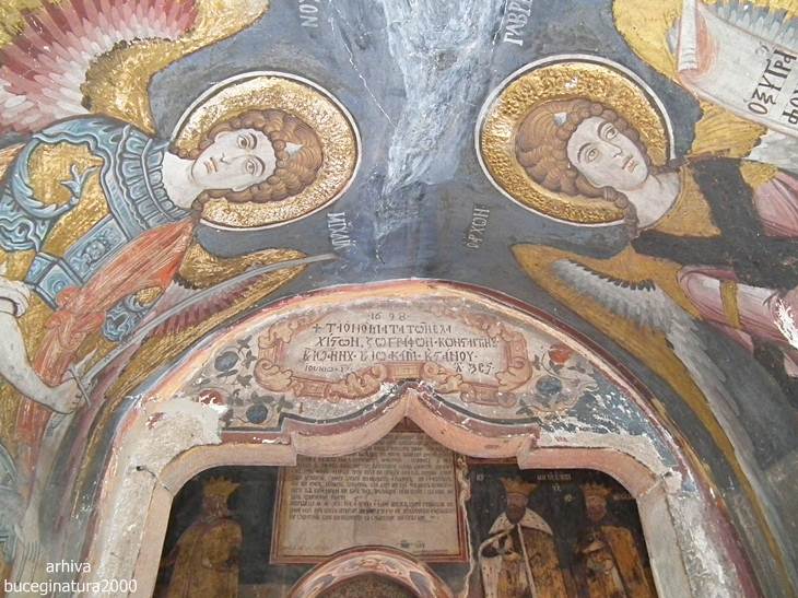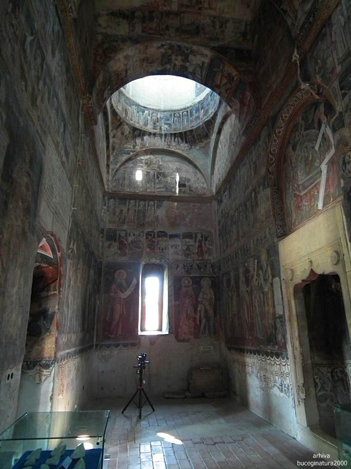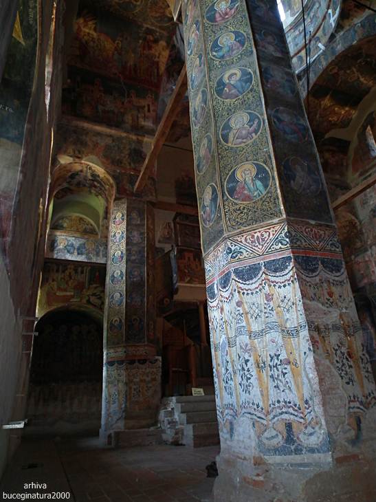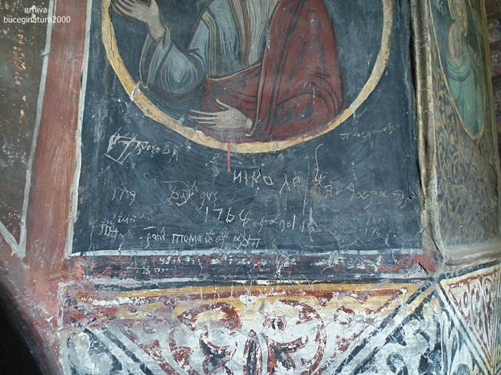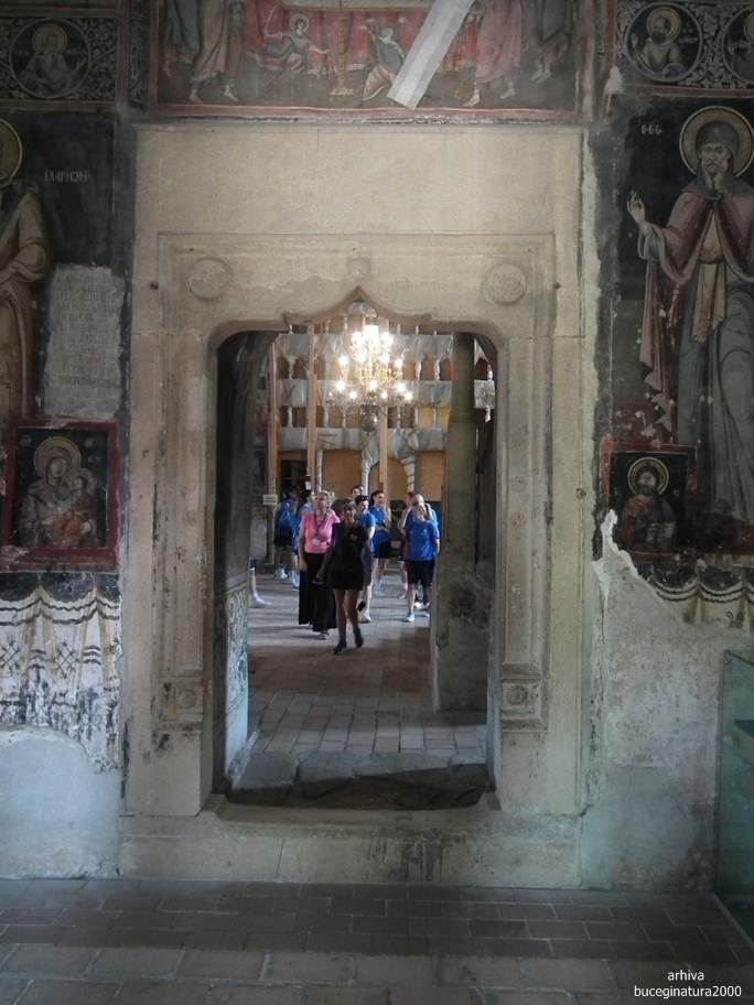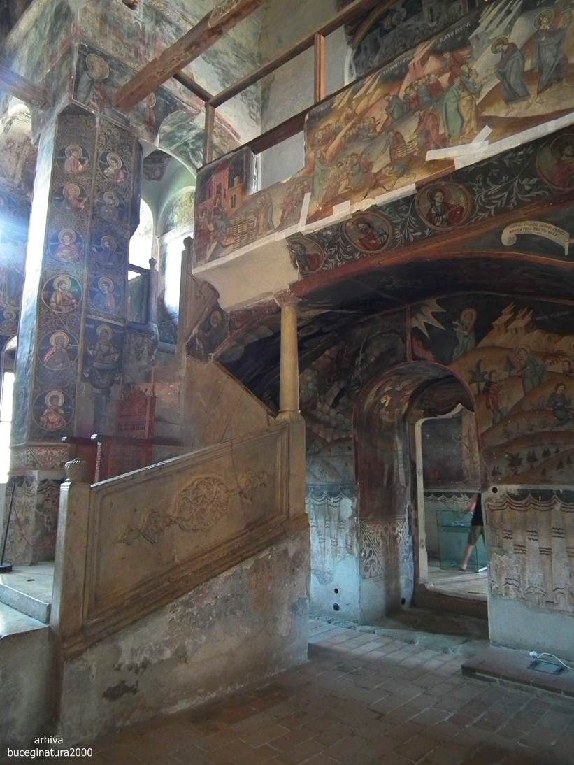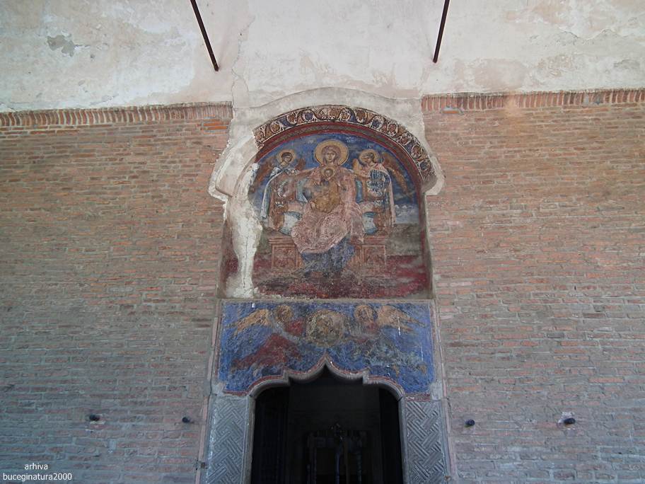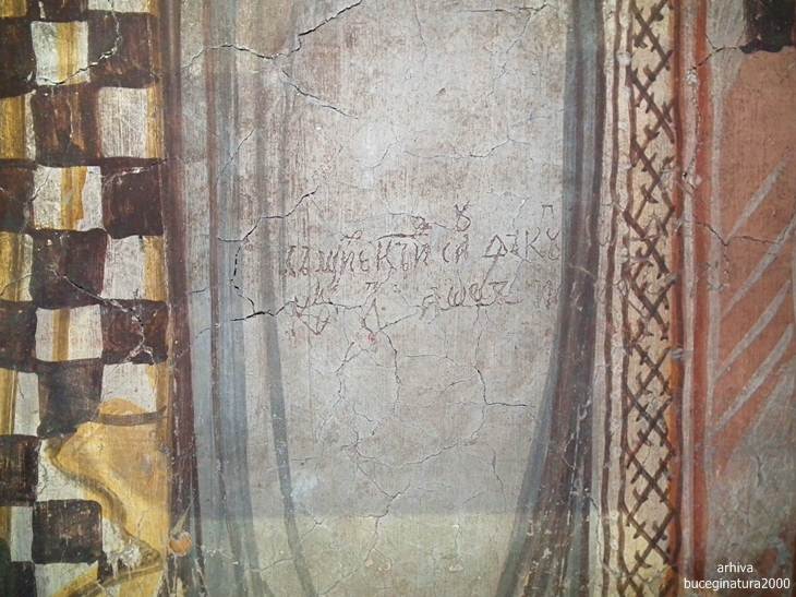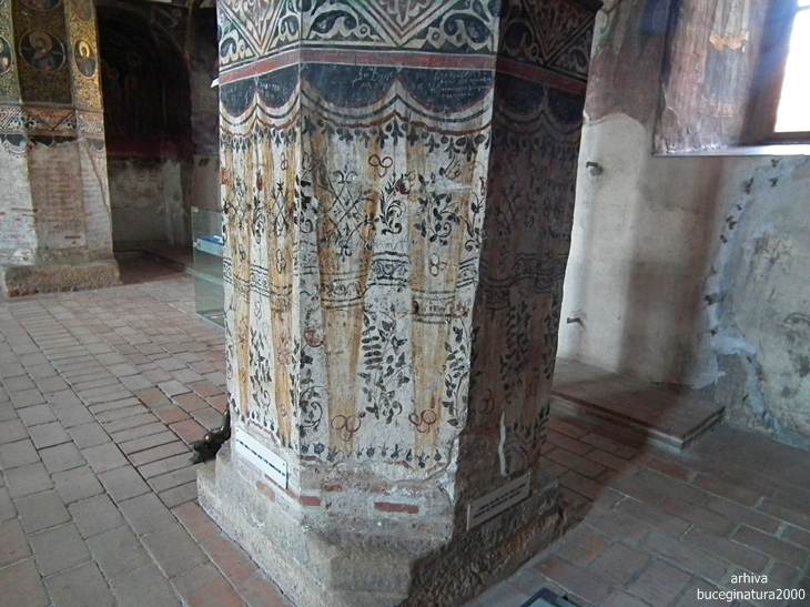 Revenind la Targoviste, la Biserica Domneasca… e de ajuns sa renunti la postura de vizitator, la omul cu atatea griji, la telefon si sa intri in ceea ce nu este altceva decat un monument viu. Oriunde iti intorci privirea, multi altii, fara numar, au trecut pe acolo. Picturile au o anumita expresivitate, vezi liniile trase acum sute de ani, culorile si desenele creaza atat peisajul vechi din mintile primilor pictori cat si peisaje mai recente, vezi inscriptii mai vechi si mai noi, iti dai seama ca tot ce numim noi degradare/lipsa restaurarii, este de fapt cea mai frumoasa marturie a istoriei noastre. Acele scrijelituri in ziduri cu litere slavone, acele pietre sparte, parti din picturile aproape sterse te introduc cu putina atentie, in lumea medievala romaneasca. Motive florale, stilul, forma pisaniei, coroanele domnitorilor, sfintii luptatori… te imping la tot felul de comparatii, le-ai mai vazut si in alte locuri. Oare pe sabia lui Nestor mai scrie numele pictorului, cum zice Iorga? Si da, scrie…