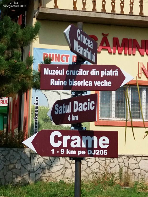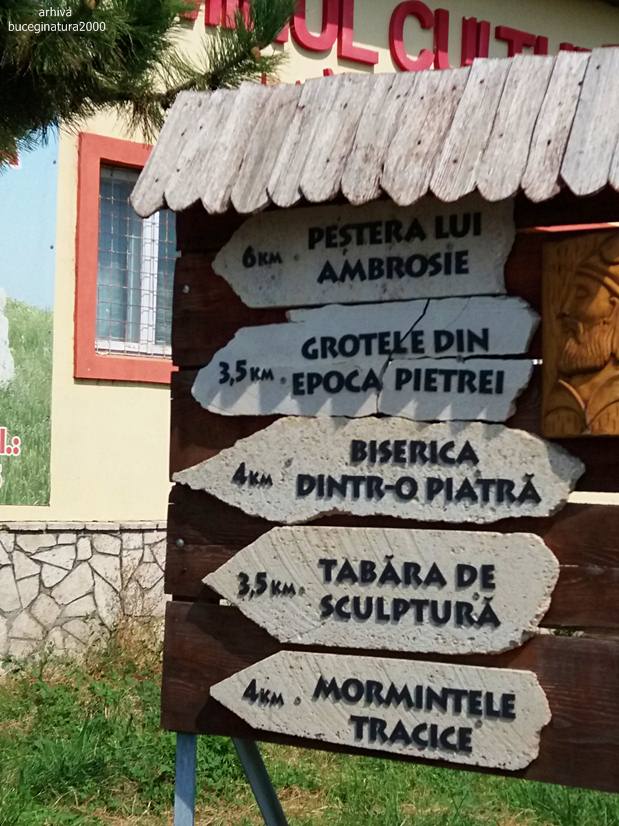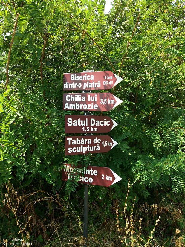 Tot in centru, langa Caminul Cultural sunt si aceste indicatoare. Acum daca tot am fost si scriu, sa-mi dau si cu parerea. Aici este bine sa lasi masina, prin zona centrului comunei daca vrei sa ajungi la toate obiectivele de pe panou. Nici cu bicicleta nu ai ce face. Spre chilia lui Ambrosie nu ai cum ajunge cu bicicleta decat daca te doare ceva. Masina se lasa aici in centru si te pregatesti pentru un traseu pe jos, de cateva ore. Dupa mine este cea mai buna varianta pentru a realiza intregul circuit.