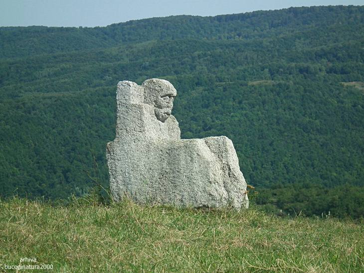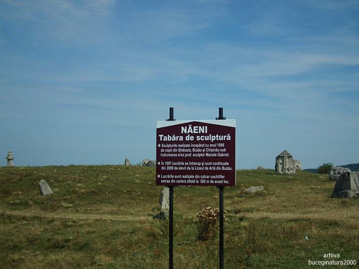 Tabara de sculptura de la Naeni. De la panou, cum te uiti in stanga spre vale, vezi Satul Dacic. Cine stie, data viitoare iese Decebal pe prispa.