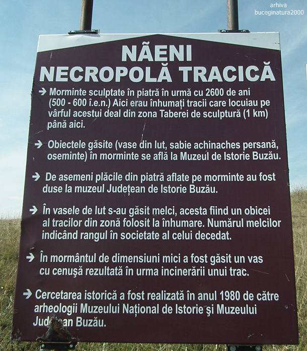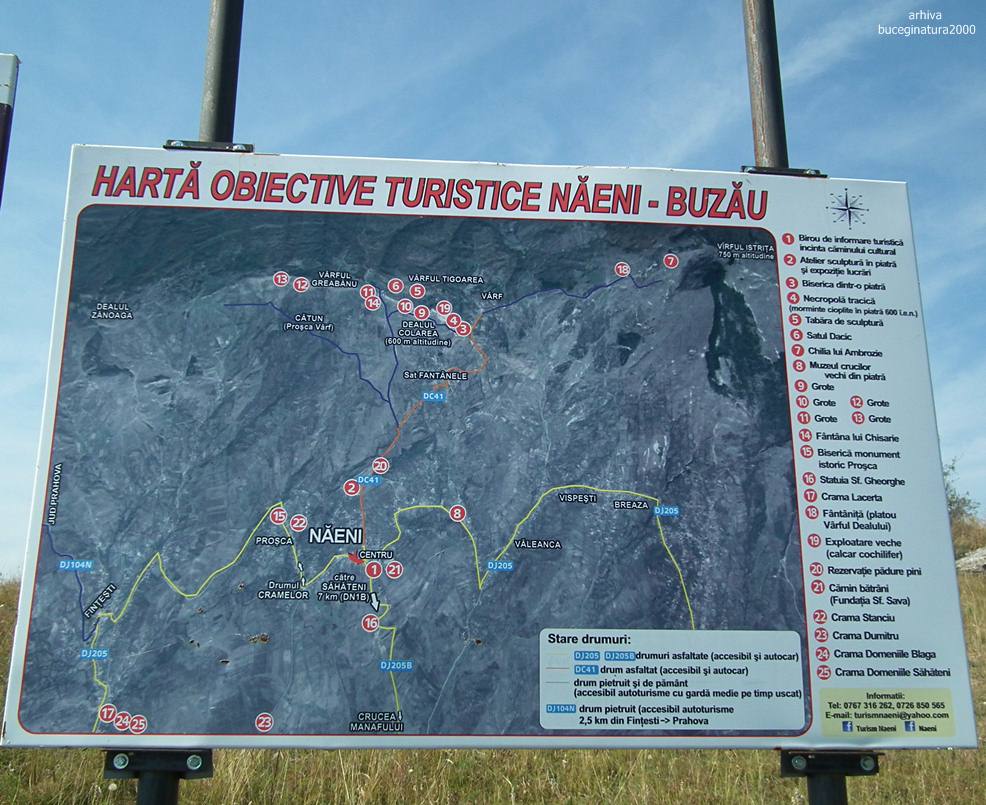 Se urca din centrul comunei pe sosea, se dau cateva curbe si vine o intersectie: inainte e drum de pamant, soseaua se duce la dreapta. Tot aici sunt si cateva indicatoare si imi dau seama ca este o idee buna sa lasi masina in Naeni. Intersectia e cam la 1 km distanta de centrul comunei.