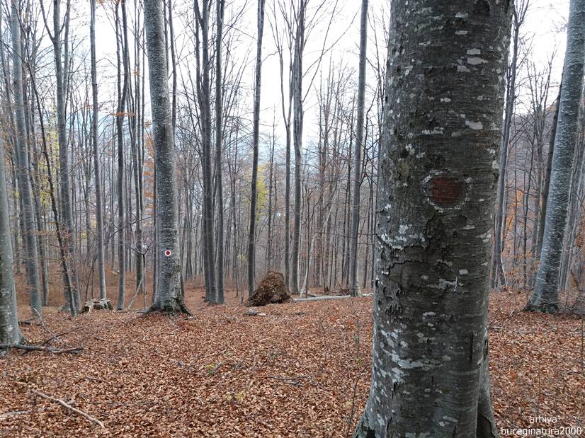 Marcajul se mai vede si dincolo de bifurcatie dar e greu de observat. Pe ceata, pe ploaie, l-am pierdut de nu stiu cate ori. Dar ne intorceam la ultimul vazut si tot asa. O data am si facut 5 ore de la schit la Cota 1000… Tot am zis sa merg intr-o zi sa fac traseul vechi pe GPS… Atat traseul cu punct rosu cat si cel cu triunghi rosu ce ajunge la Moieciu, le-am realizat integral, avand norocul sa le parcurg inainte de anumite lucrari la padure si la DJ 713.