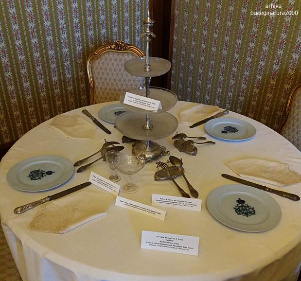 Serviciu de masa, cam ce folosea domnitorul :) Pe fiecare obiect apar/e stema Principatelor si/sau monograma lui Cuza. Monograma se vede bine pe farfurii.