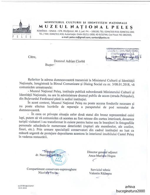 Legat de o sesizare a mea catre Ministerul Culturii, ca nu mai sunt expusi niste caini din bronz la Peles si ca de vreo 3 ani nu se repara un parapet de pod, iata si raspunsul de la Muzeul National Peles :)