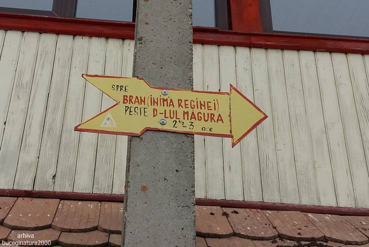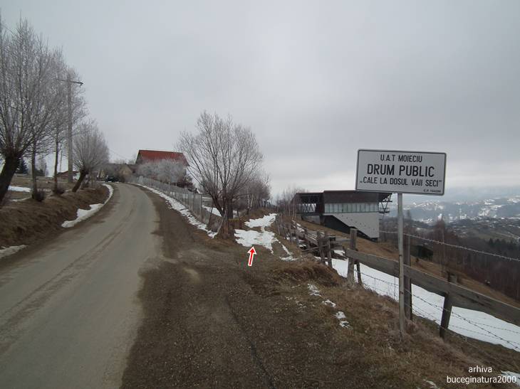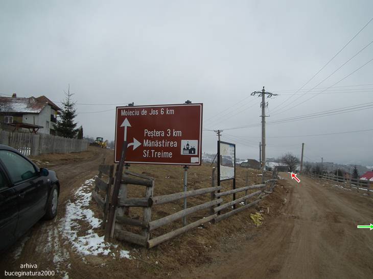 Intersectie: cu sageata rosie drumul spre Moieciu, cu sageata verde spre satul Pestera si Manastirea „Sf. Treime”, apoi tot la Moieciu.