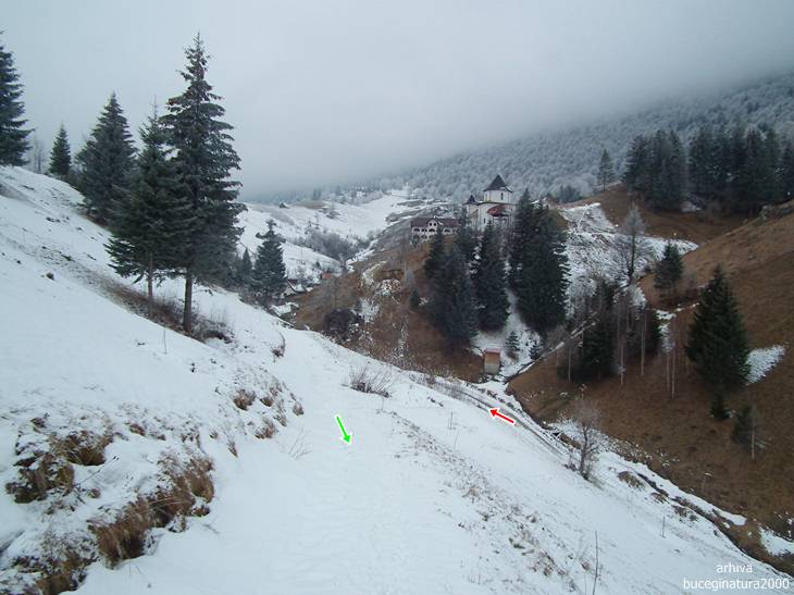 Cu sageata rosie drumul spre manastire. Ne-am intors de la manastire tot pe drum pana la intersectia cu drumul de pamant ce urca in serpentine, marcat in imagine cu sageata verde.