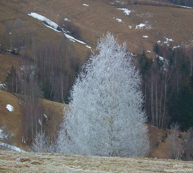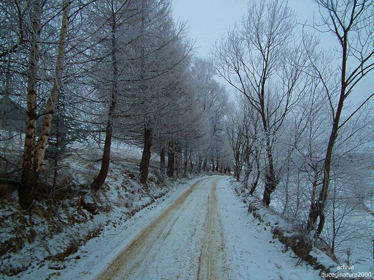 Vremea era destul de rece, pe arbori statea zapada… ajungem insa si la primele constructii din Magura si destul de repede la o intersectie: inainte ajungeam la Moieciu de Jos dupa 6 km, la dreapta ajungeam la Manastirea „Sf. Treime” Pestera. Ne uitam la ceas si de la gara din Zarnesti pana aici, am facut o ora si 43 de minute. Daca o luam spre Moieciu parca se termina prea repede traseul. Hotaram sa nu mergem spre Moieciu pe acel drum, de care oricum nu stiam :) In cele din urma tot pe acolo o luam :)) Pentru ca acolo era si biserica satului. O vazusem intr-o fotografie a lui Adrian Petrisor, intr-un calendar. Adrian Petrisor este un tip care face niste poze superbe… http://www.adrianpetrisor.ro/