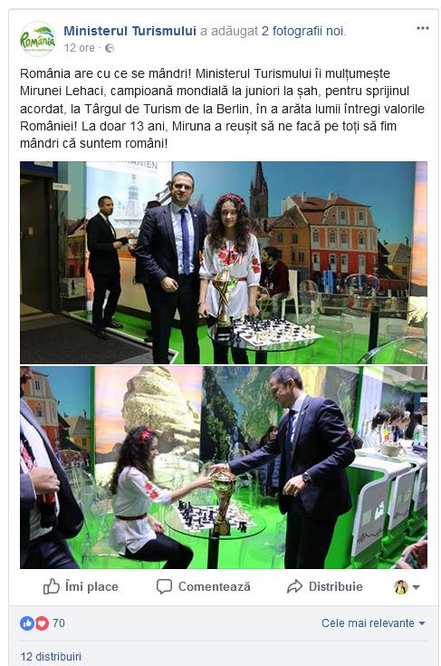 Sunt praf e clar. Regula in turismul national este clara de decenii: nu te lasa in baza ministerului ca niciodata nu a putut face ceva serios. Au avut initiative fara rezultate clare si cam atat. Acum s-au dus la un Targ ca sa arate ce? Ca Romania are o campioana la sah?..