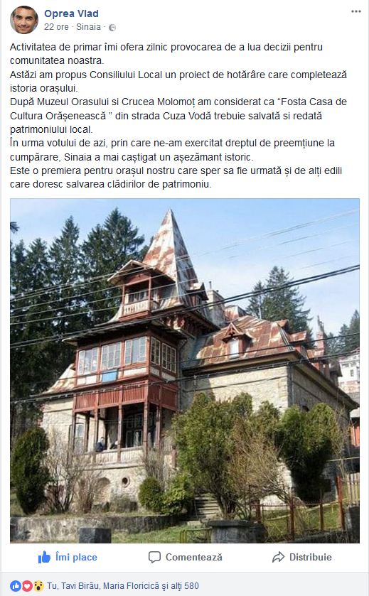 Un eveniment aproape nemaivazut in judetul Prahova si foarte rar in Romania. O primarie cumpara o vila, declarata monument istoric, aflata in paragina, tocmai pentru a o restaura. Respectiva constructie a fost acum multi ani, Casa de Cultura a orasului Sinaia.