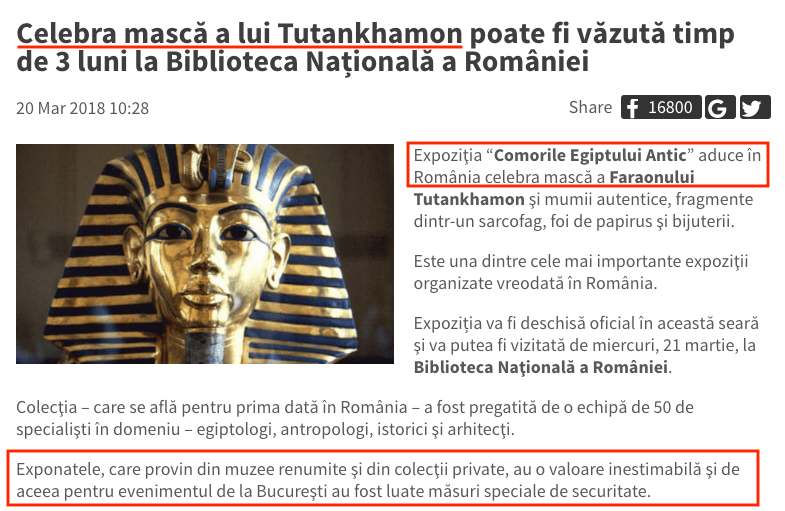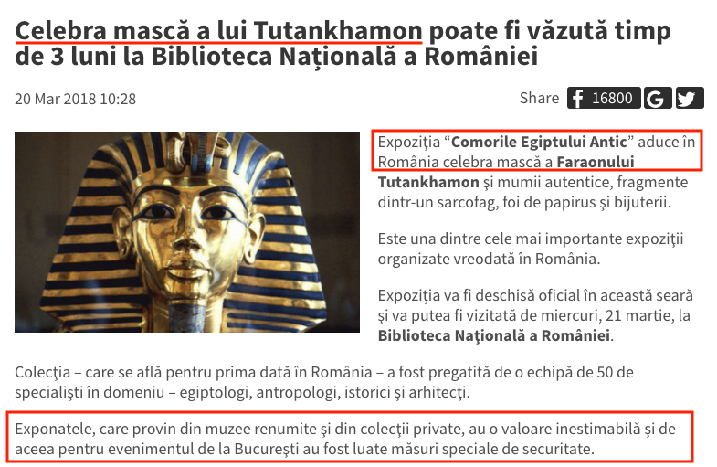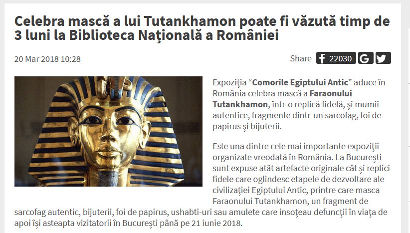 Cred ca foarte multi au auzit ca la Bucuresti a ajuns „Masca lui Tutankhamon” si foarte multi si-au pus problema vizitarii spatiului special amenajat de la Biblioteca Nationala a Romaniei. Chiar ma gandeam ca este o ocazie ce nu trebuie pierduta. Si ieri citesc o stire documentata, text, filmulet…