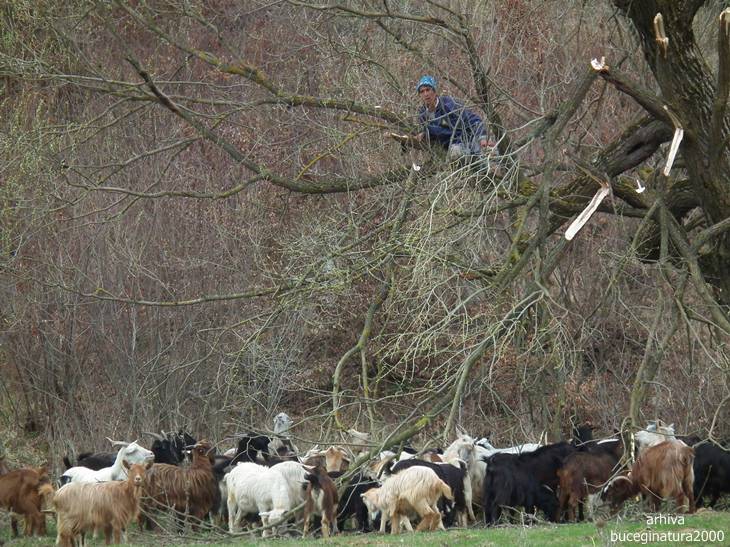 Nu ati vazut asa ceva, nu? :)) Asa se da de mancare la caprite :) Te sui in copac si tai crengi… In dreapta, se vede ca o capra a incercat sa-l imite pe stapan.