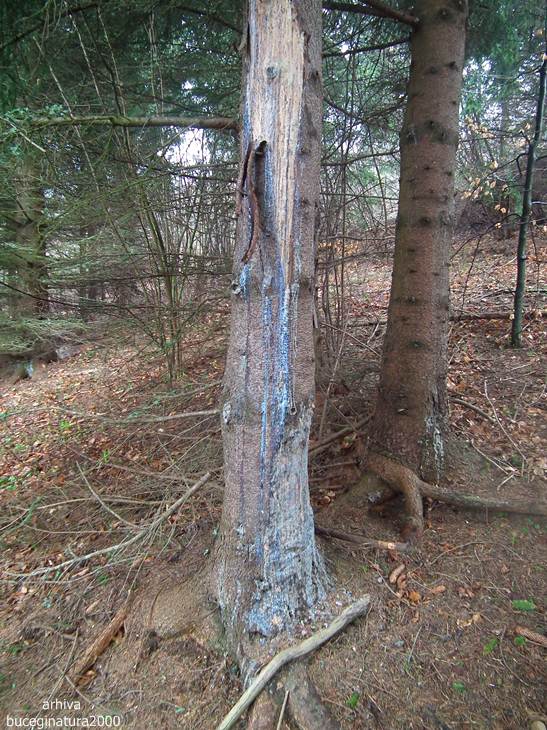 Evident, opera unui Martin care s-a intins pana la 2,10 m. Sa jupoaie el bietul arbore. Si parul prins de molid arata cine „s-a luptat” pe aici: