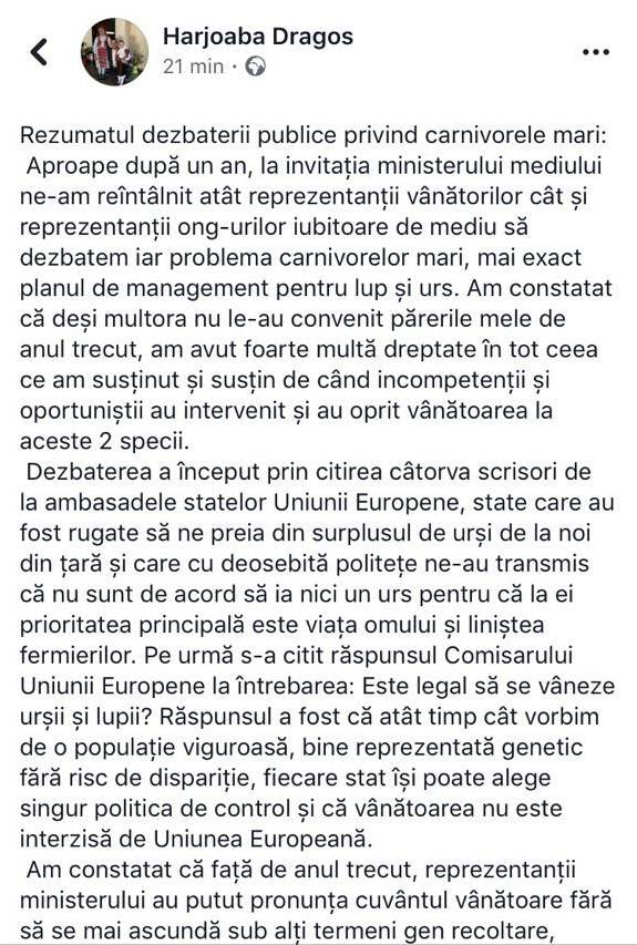 Faptul ca sustii ca intra oricine prin padure cand vrea… si ia la ochi orice urs doreste, arata ca nu dai doi bani pe legile din tara asta si pe cei care trebuie sa le aplice, ca nici macar nu ai cea mai mica notiune despre pasii ce trebuie urmati pana sa se poata impusca un urs. Daca isi mai poate imagina cineva in zilele noastre, ca mergi tu prin padure si tragi in ce vrei, mai ales cand vrei sau mai ales cand se posteaza pe Facebook iesirea unui animal din padure, inseamna ca e departe rau de realitate. E atat de penibil si de ridicol incat refuz sa intru in orice polemica de acest gen.
