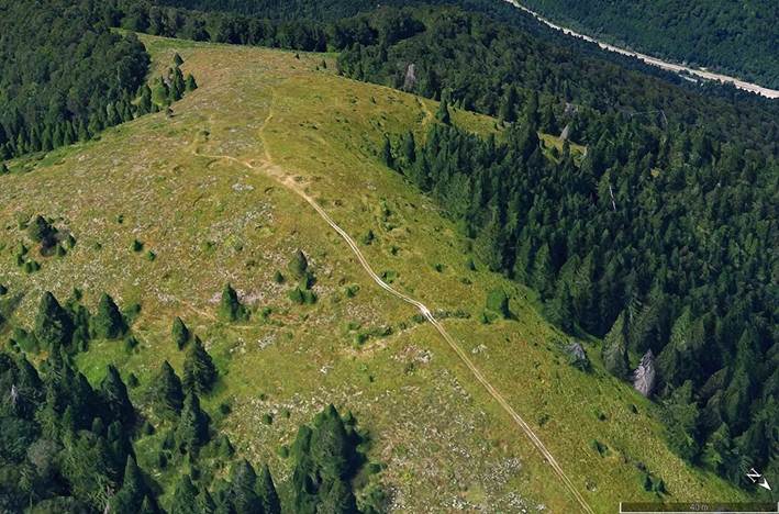 Cratere de obuz și urme de tranșee pe Clăbucetul Taurului, în zilele noastre. Imagine compozită, generată cu ajutorul Google Earth Pro.