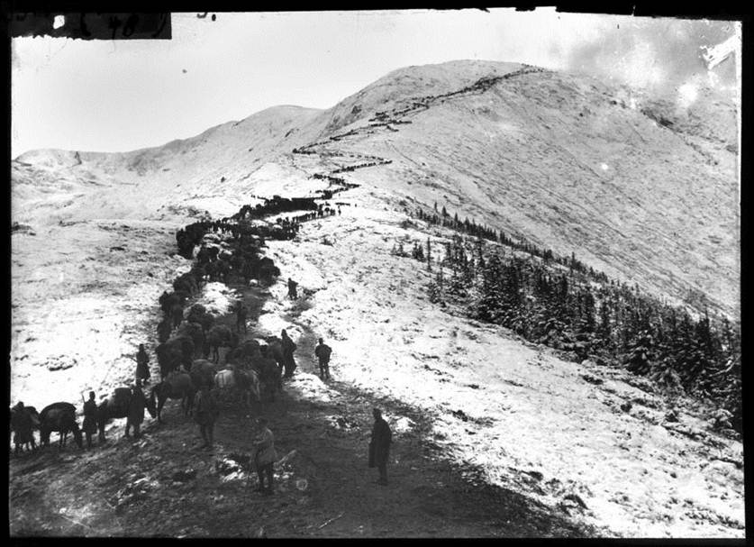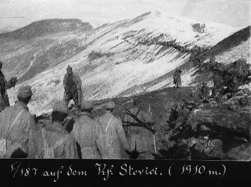 Trupe ale Regimentului 187 pe Vârful Șteviei, în Munții Neamțului.