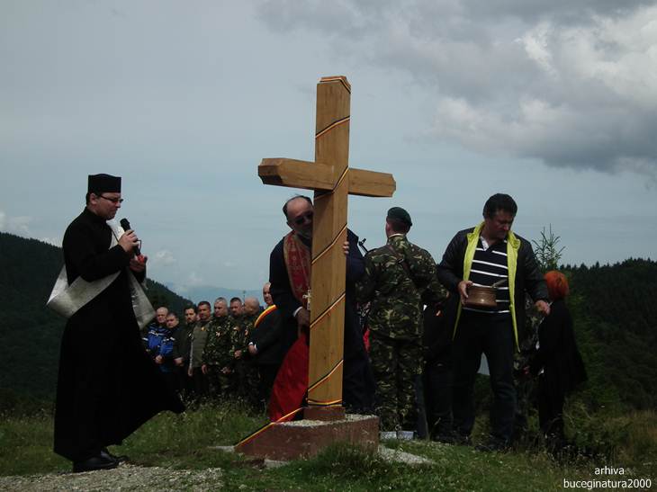 Reprezentantii Predealului. Cel cu ie este unul din artizanii ridicarii acelei cruci, un om special, d-l Turea Iliuta. El a transportat toate materialele pentru ridicarea crucii si, alaturi de d-na director a Casei de Cultura din Predeal plus Salvamont s-au preocupat de buna organizare la fata locului, a evenimentului.