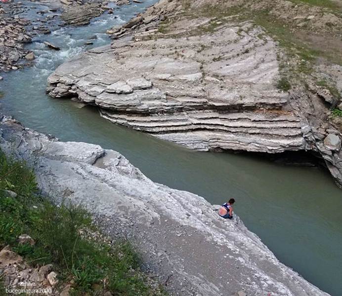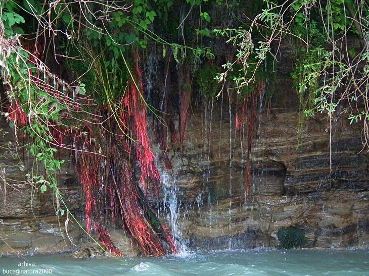Un izvor ce iese dintre straturi si se varsa in rau.