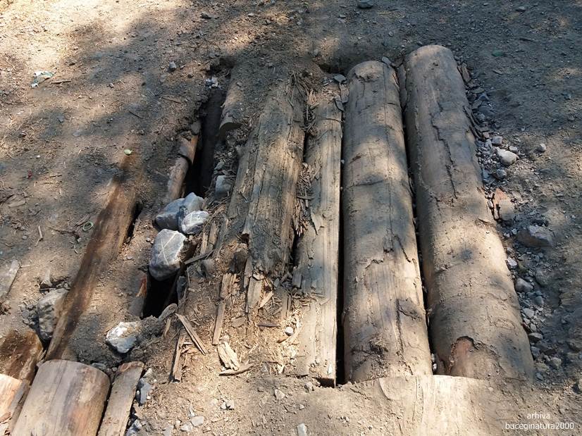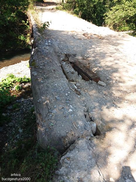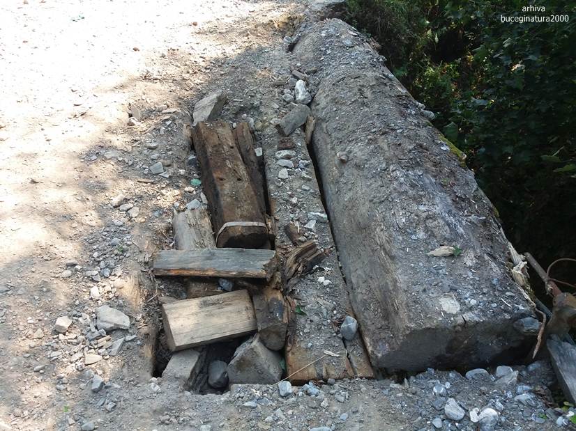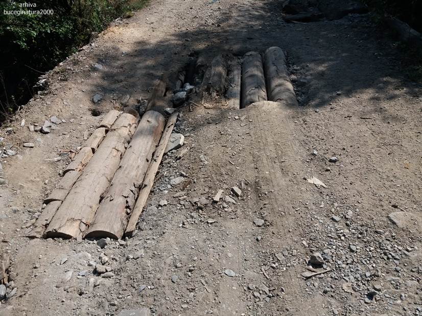 Tot langa gara Azuga este si un pod prapadit, peste Prahova. O data trecut, ai intrat pe Valea Grecului, marcaj triunghi galben… Iata cum arata podul peste care trec zilnic cel putin doua masini mari cu busteni. Plus altele de capacitate mai mica. Dincolo de pod, deci in padure, mai sunt si buldozere…