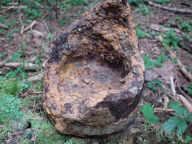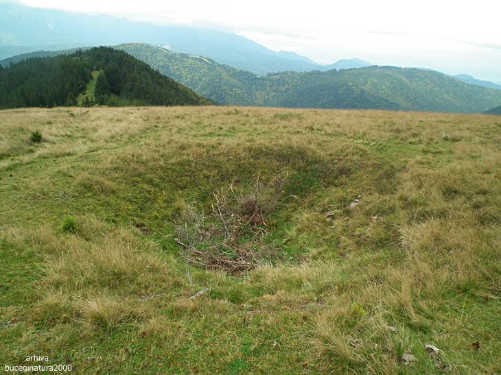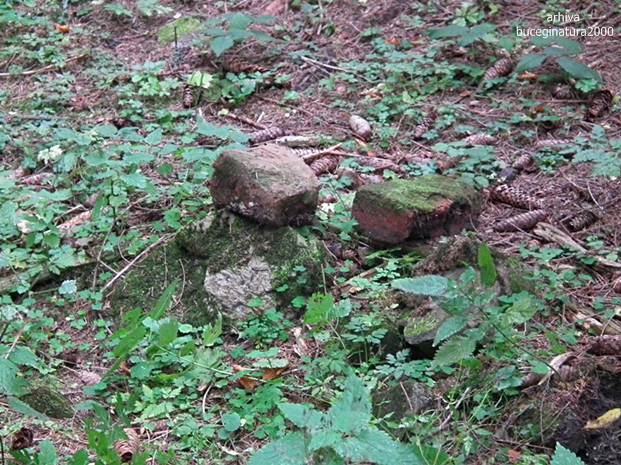 Ma uit de jur-imprejur, uitasem de cerbi, de orice :) Vad un crater si zic: un pichet de graniceri distrus de bombardament. Niste ruine situate mai departe, ascunse de vegetatie, imi intregesc concluzia. Deci artileria germana a tras de la Timisul de Sus un singur obuz, in toamna anului 1916 si au distrus o cladire situata in imensitatea padurii. Obuzul a cazut la mica distanta de acea constructie (nu era pichet) si a pus-o la pamant.