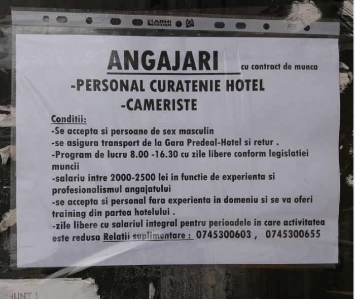 In toata Valea Prahovei au aparut oferte de angajare, fiecare incearca sa-si aduca oameni, sa-i fidelizeze, forta de munca nu mai este… Imi spunea cineva asa: „Inainte, patronul iti spunea sa faci orice, ca daca nu sunt 100 la poarta ca sa-ti ia locul; azi nu mai sunt nici stalpii de la poarta!” :))