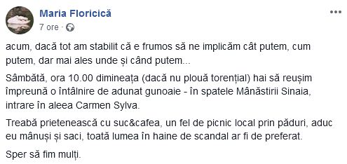 Sunt anuntate in week-end alte ecologizari si la Sinaia si la Busteni, initiative ale unor oameni cunoscuti din cele doua statiuni: d-na Maria Floricica la Sinaia si d-l Mircea Corbu la Busteni, detalii pe conturile lor de Facebook.