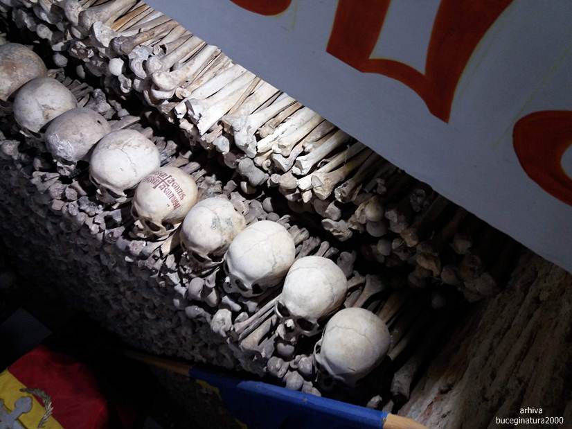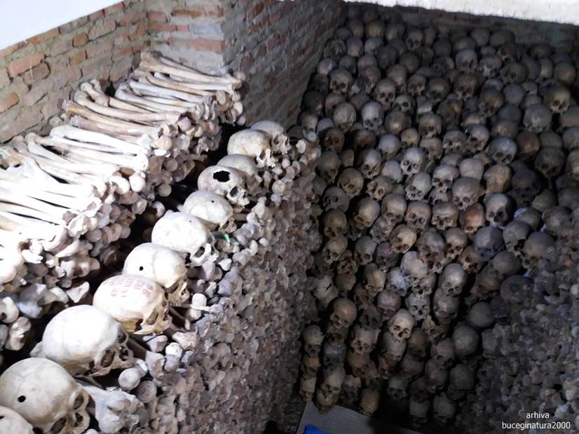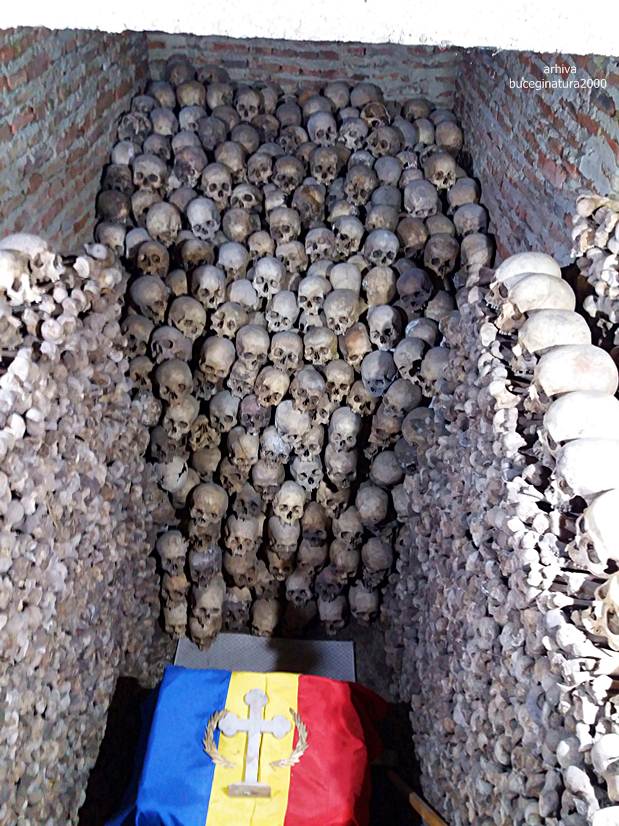 In mausoleu. In fata, se observa fixat in podea, un suport din lemn. Pe acolo te uiti in cripta cu oseminte si vezi asa: