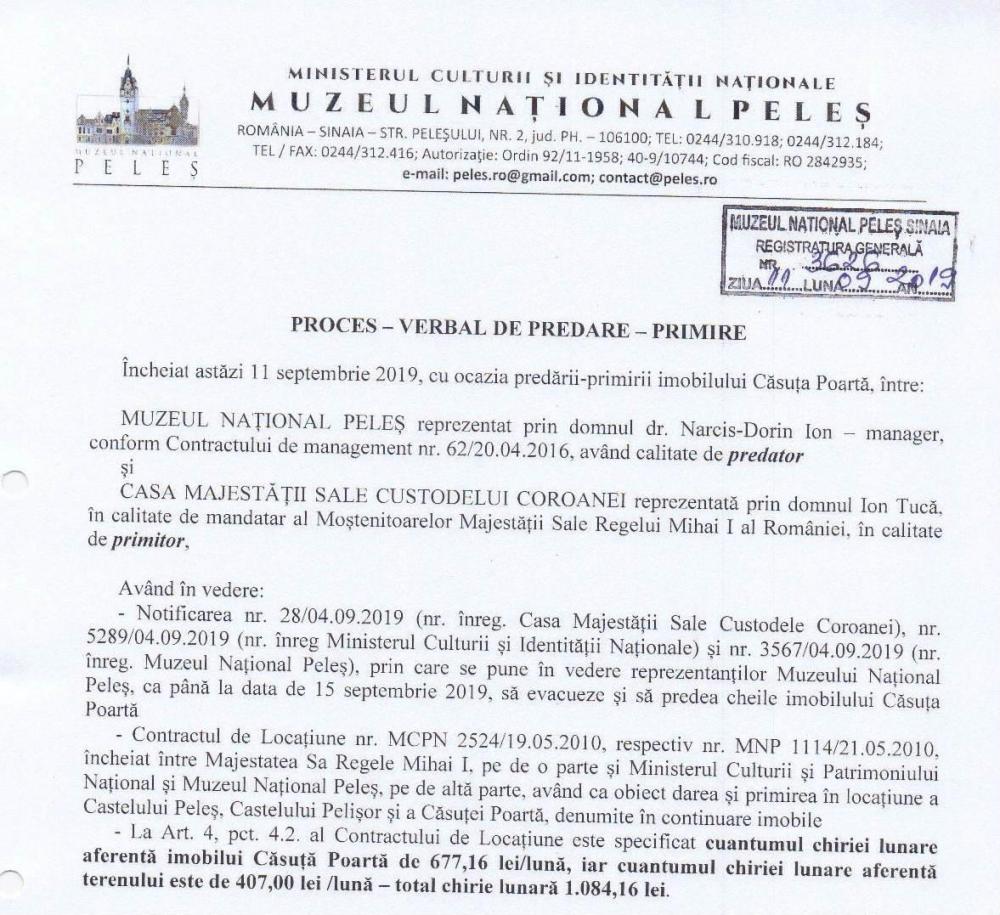 Si… s-a facut predarea Casutei Poarta, constructia aceea de la Peles aflata pe stanga aleii, putin mai sus de ultimele chioscuri, nefolosita, catre Casa Regala:
