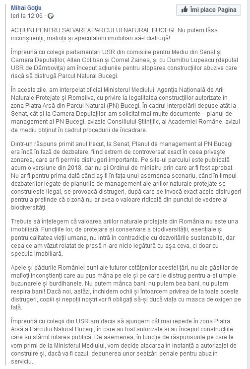 Treaba cu actiunea parlamentarilor sta asa… e bine ca USR a ajuns in Parlament fiindca sunt vocile unor deputati si senatori care striga pentru Parcul Natural Bucegi. Numai ca nu e vorba de niciun abuz, oamenii acestia cu vilele sunt cu acte in regula proprietari. Problema e mai indepartata: cum de au fost pusi in posesie cate unii pe terenuri situate intr-o arie protejata, e legala introducerea in intravilanul unei localitati a jumatate din Bucegi… Referitor la actele de mediu, de ce nu apar in timp util pe site-urile institutiilor de mediu astfel de cereri de autorizare? E clar de ce…