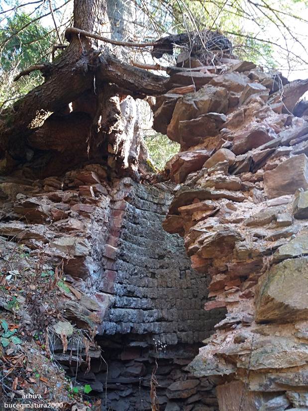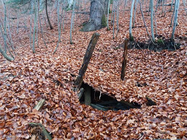 Ce sa caute o usa metalica pe la jumatatea unei pante, stiind ca „de sus” nu are cum sa ajunga… In fine, cumva a ajuns dar probabil folosea la ceva. Ma uit prin preajma si vad mai sus un adapost prabusit: