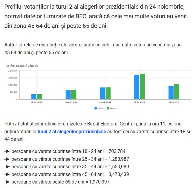 Ce intelegem? La prima vedere ca pe masura ce alegatorii sunt mai tineri, nu prea au mers la vot. Aceasta este si opinia multor analisti.