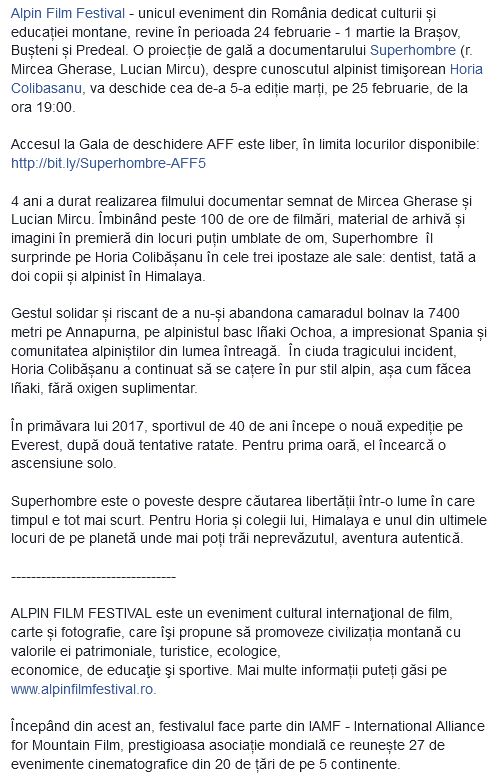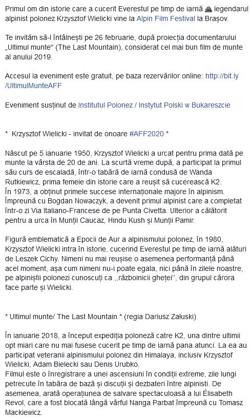 Aceste evenimente reprezinta doar o parte din program. Intregul program poate fi parcurs pe site-ul festivalului: https://alpinfilmfestival.ro/