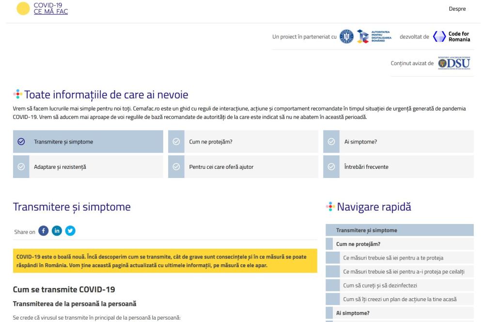 Un proiect al unor voluntari IT arata cat de multi romani capabili avem in tara. Tot ce vrei sa stii, sa fii corect informat despre COVID-19, se gaseste pe site-ul cemafac.ro dezvoltat cu o serie de institutii partenere inclusiv cu Guvernul Romaniei: