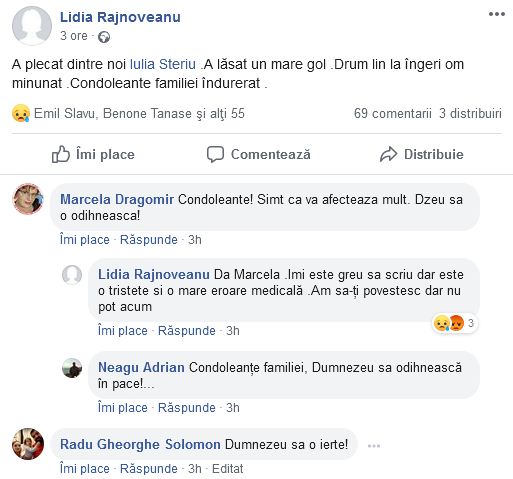 Trist, foarte trist. Intai sa afli aceasta cumplita veste, iar apoi ,,sa intelegi” de ce s-a intamplat! Oare intelege cineva, in ce societate,, cancerigena” traim, unde fiecare este pentru el, iar statul nu face absolut nimic pentru cetatenii sai. Doar mimeaza! Nu exista Societate, nu exista Respect, nu exista Regula si aplicarea acesteia, nu se face nimic pentru respectarea Demnitatii umane, nu exista decat Compasiune la urma! Trist, foarte trist, ca Romania este o tara fara propria Constiinta! Ramai Iulia in amintirea noastra, exact asa cum ai fost Tu! Dormi in Pace!
