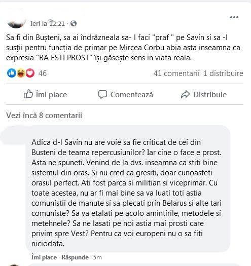 Citez aproximativ: „Sa fi din Busteni, sa-l faci „praf” pe Savin si sa-l sustii pe Mircea Corbu asta inseamna ca expresia „Ba esti prost” isi gaseste sens in viata reala!”