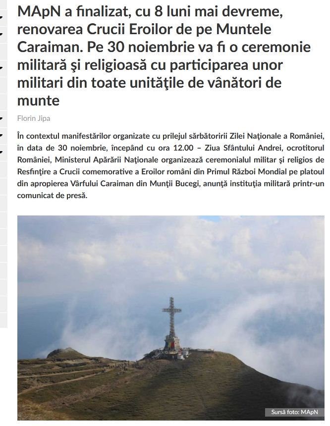Mai am o stire militara. Se aude ca Secretariatul General din MApN impreuna cu „celebra” Directie Domenii si Infrastructura a reusit o operatiune-surpriza :) adica au incheiat lucrarile la Monumentul Eroilor de pe muntele Caraiman (ei in proiect au sustinut ca monumentul este pe varful Caraiman! :) Daca erau aceia de la Contabilitate mai aveau o scuza).