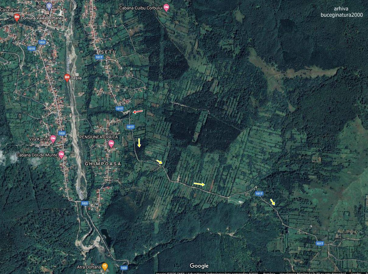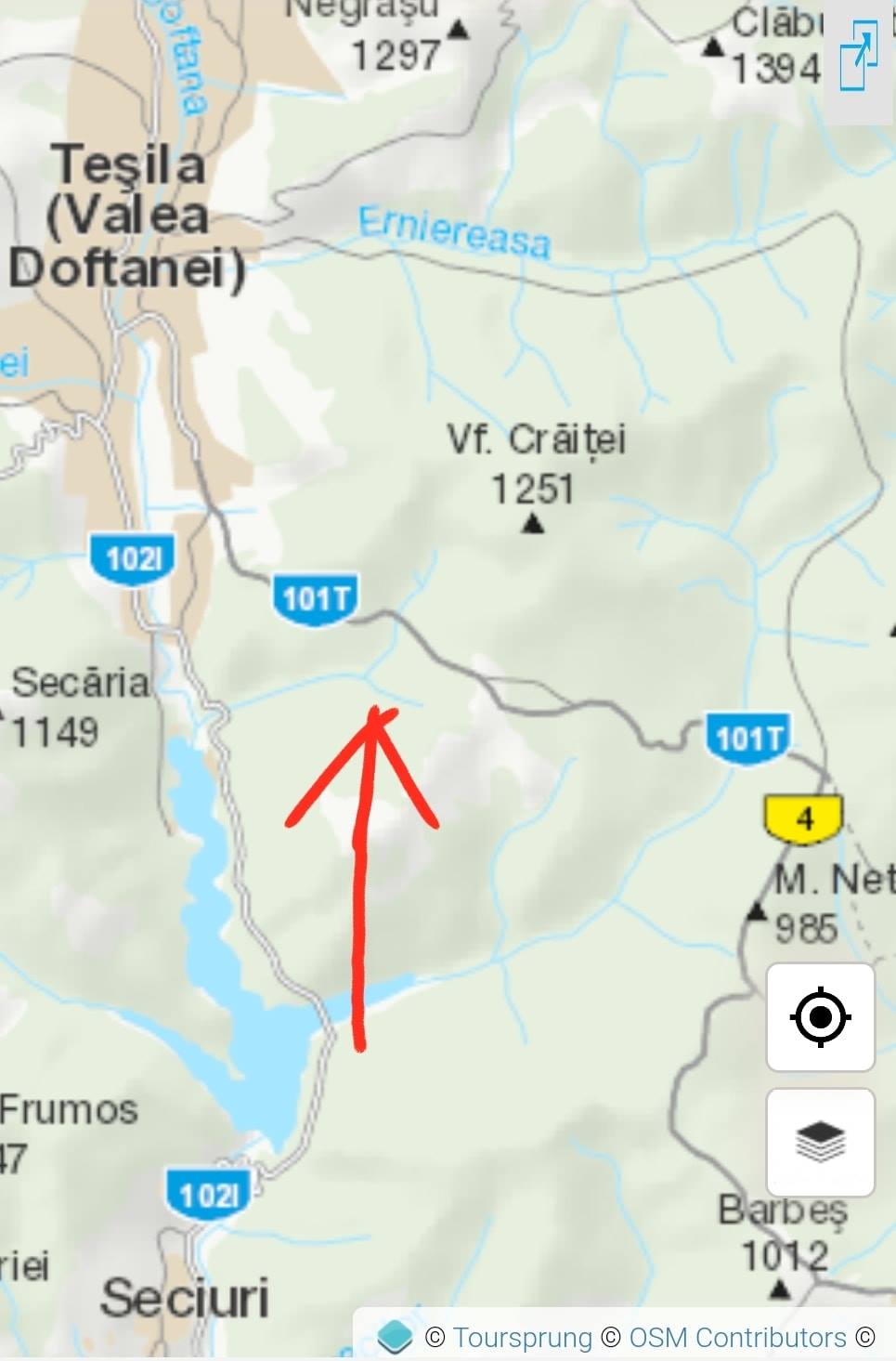 Vedem pe harta drumul judetean 101T. In realitate, pana la sageata rosie pusa de mine, este o strada obisnuita care face parte din comuna Valea Doftanei, nicidecum un drum. Exista si un indicator pe acolo pe care scrie LUTU ROSU la care satenii rad cand ii intrebi daca e drum pana acea localitate. „Sunt nebuni!” asta mi-au zis cand i-am intrebat de acel drum, eu fiind cu bicicleta si uitandu-ma la indicator. E clar ce crede lumea despre astia cu drumul lor.