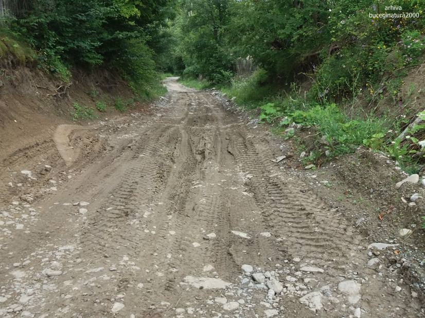 Acesta e drumul 101T. Aici o sa fie nevoie de vreo 2 kilometri de serpentine. Se ajunge in culmea dealului dupa care pe un drum de pamant distrus de ape si exploatari forestiere se ajunge in Lutu Rosu. Si aici e de lucru mult de tot, kilometri buni de amenajat, rape, valcele, pante…