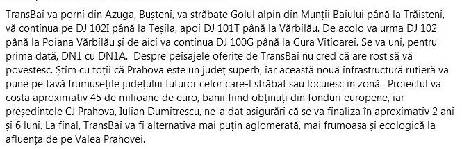 Consider ca aceasta initiativa a aparut mai ales pentru a se cheltui o suma uriasa, adica 45 de milioane de euro. Asa au inventat un proiect mai mare prin prelungirea TransBaiului. In mod evident, nu a fost nimeni in teren sa vada daca unele drumuri exista sau daca exista, cum arata acestea?! De ce spun asta? Pentru ca in mare parte segmente din traseu nu exista sau sunt deja asfaltate. In aceasta vara le-am accesat cu bicicleta :) Deci, este doar o lovitura de imagine… la adapostul unei asa-zise dezvoltari se doreste sa se dirijeze niste bani. Mai ales ca sunt bani europeni.