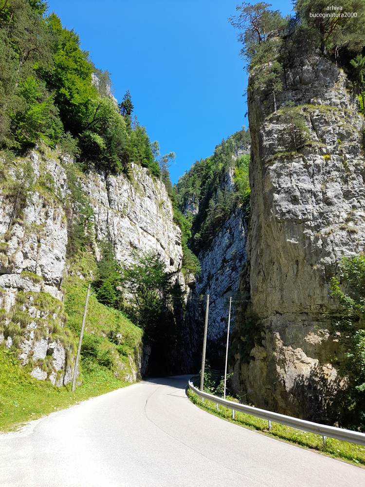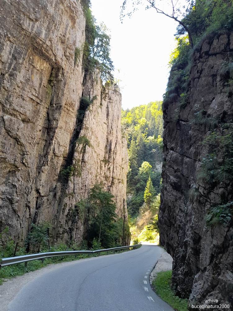 Mai urcam un pic, vreun kilometru sau doi pana in Curmatura Posadei si la vale din nou. Facem dreapta spre Cheile si Pestera Dambovicioarei, un cadru de vis cu suficiente masini dar si oameni care mergeau pe jos. Unii erau cazati in unitati turistice si faceau excursii prin imprejurimi.