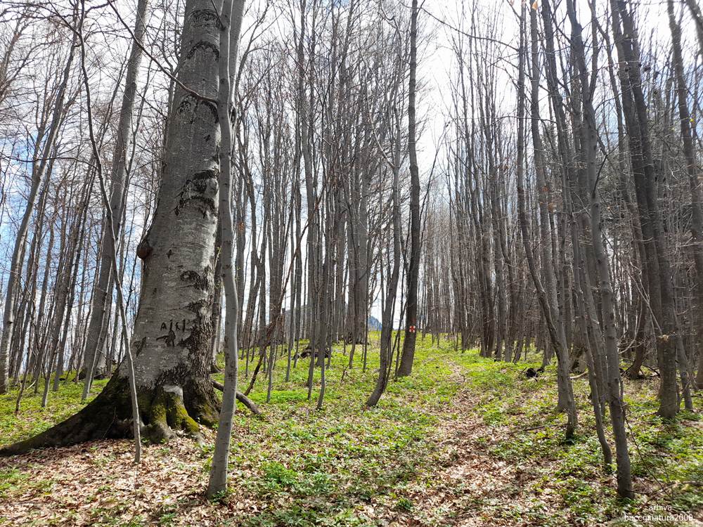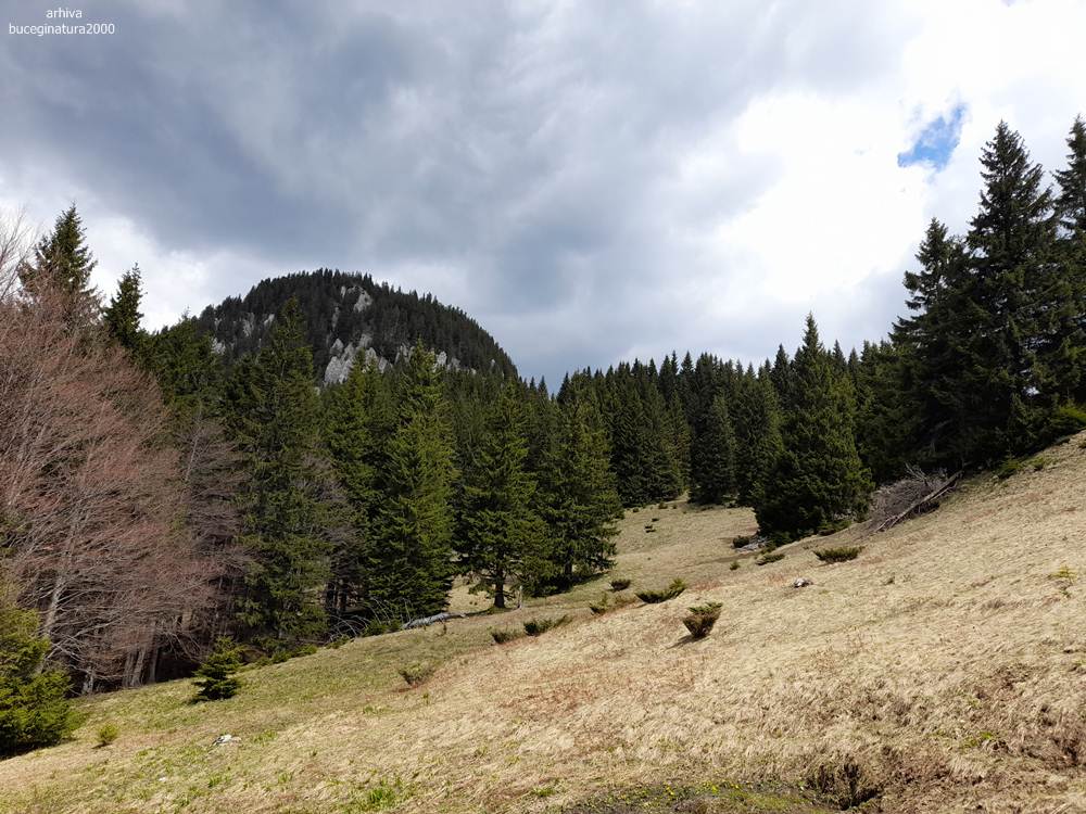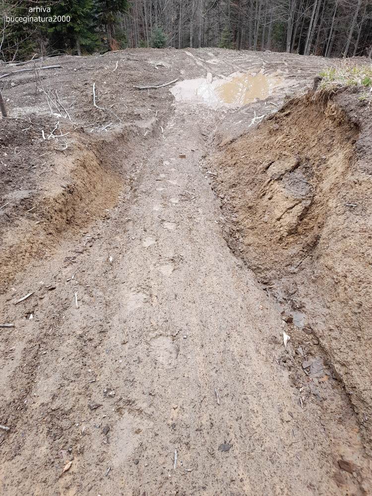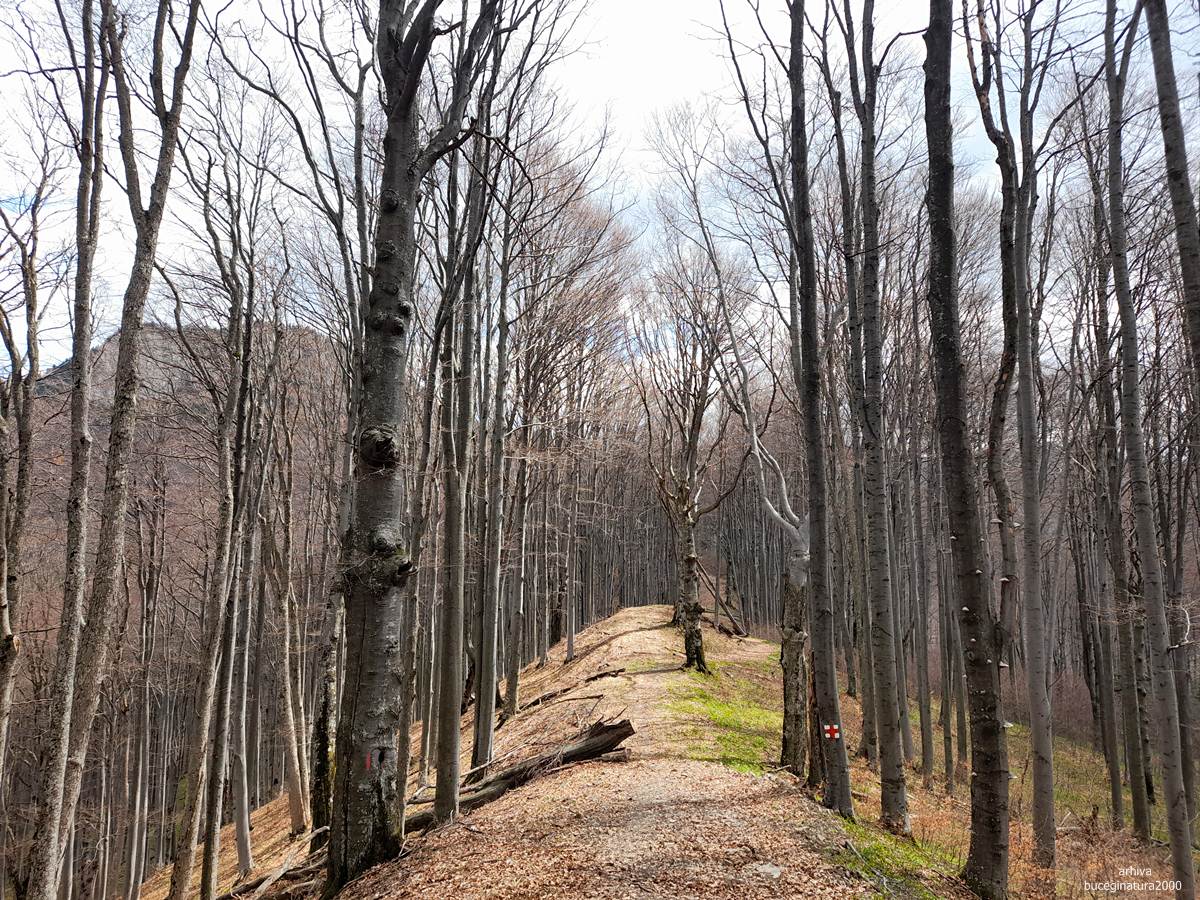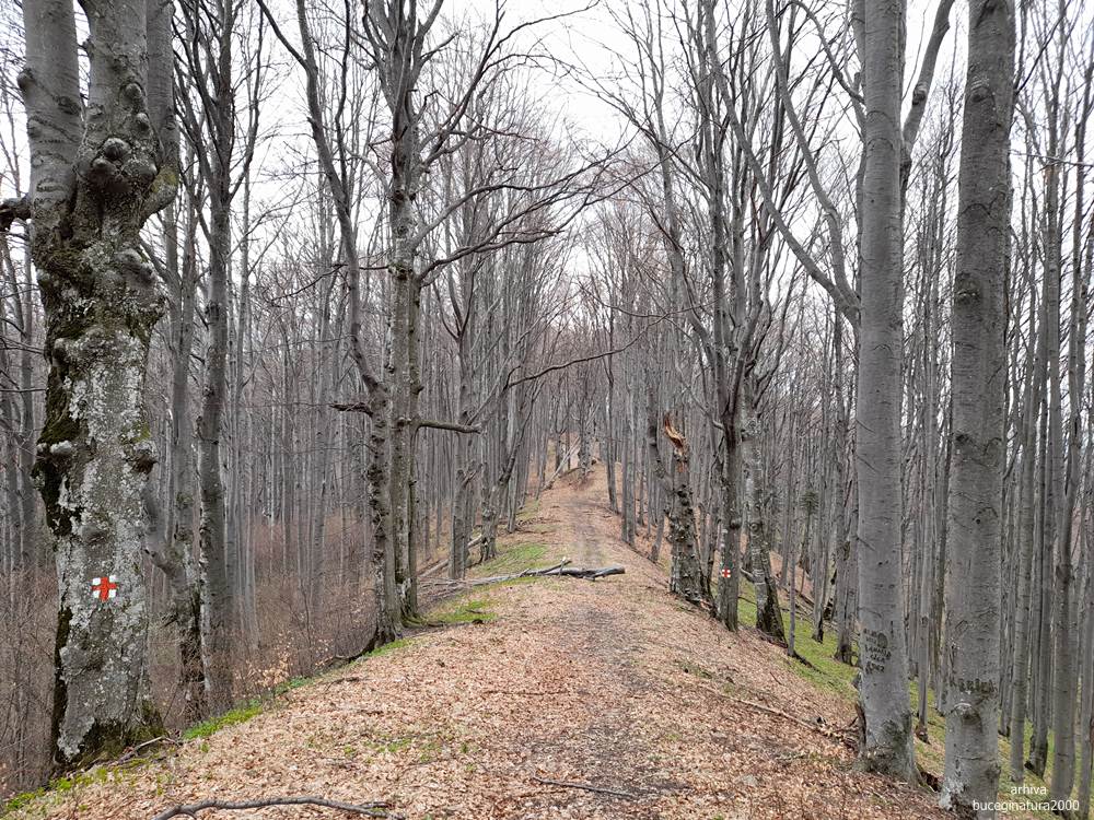 In stanga, majoritatea arbustilor nu prea au coaja, caprioarele au mancat-o in timpul iernii. Iar pe jos, pe unde se vede verde, trebuie un pic de atentie. Cei care au curatat traseul au taiat arbustii de la 15-20 cm de sol si nu vezi cioatele, te mai si impiedici la un mod trist :))